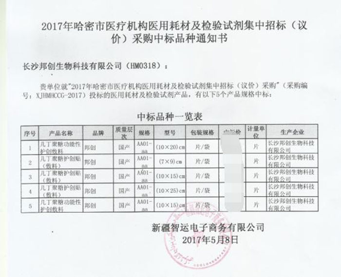 恭賀我公司產(chǎn)品在2017年新疆哈密醫(yī)用耗材招標(biāo)采購項目中標(biāo)