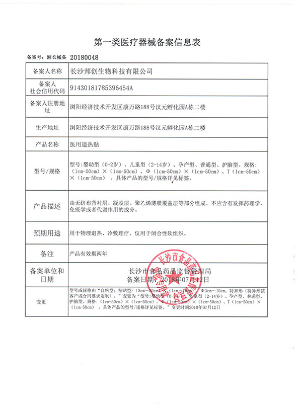 醫(yī)用退熱貼備案信息表